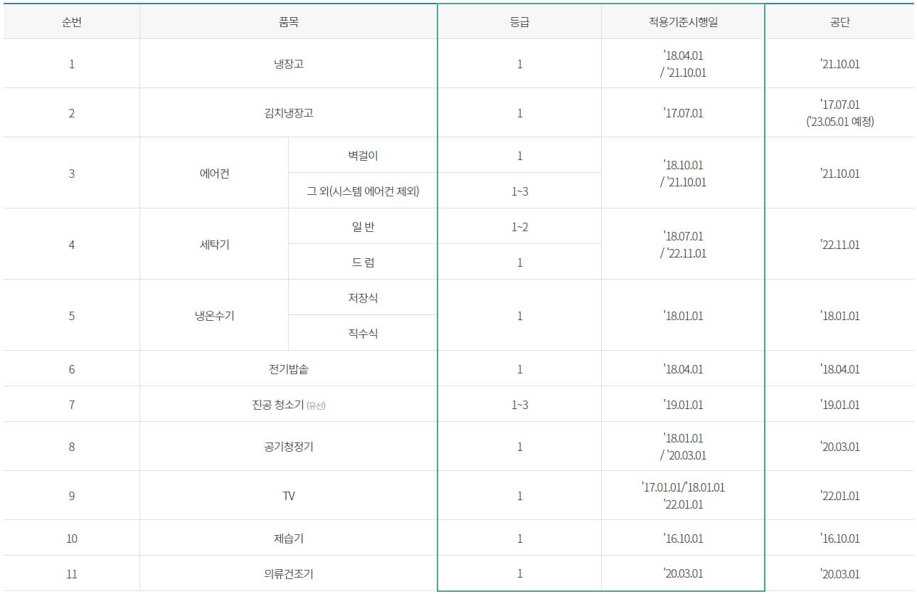1등급: 냉장고, 김치 냉장고, 에어컨(벽걸이), 드럼 세탁기, 냉온수기, 전기밥솥, 공기청정기, TV, 제습기, 의류 건조기