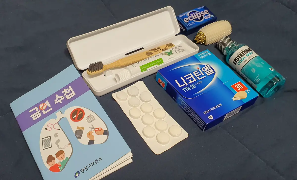 금연 클리닉 상담 후 받은 물품입니다. 금연수첩, 칫솔, 치약, 리스테린(구강청결제), 지압기, 이클립스(멘솔 캔디), 금연 패치, 금연 캔디 이렇게 총 7개 정도 받았습니다. 이 중에서 니코틴 패치와 캔디가 금단현상을 억제해 주는 역할이라 중요한 물품이었습니다. (우선 1주일 분량을 받았으며 1주일 후 다시 방문해야 합니다.)